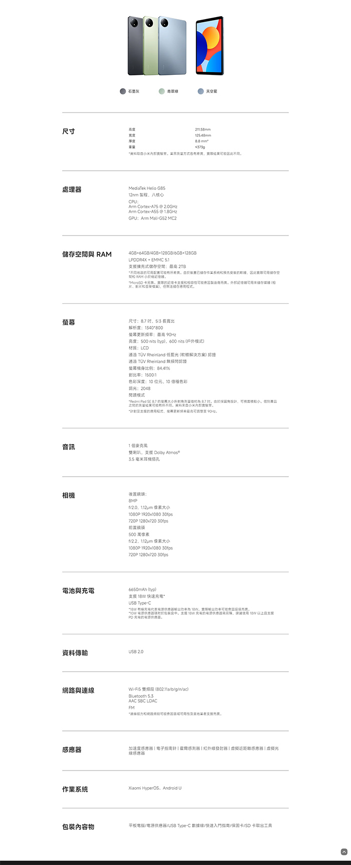 | 內容物 | 平板電腦 / 電源供應器 / USB Type-C 數據線 / 快速入門指南 / 保固卡 / SD 卡取出工具 |
