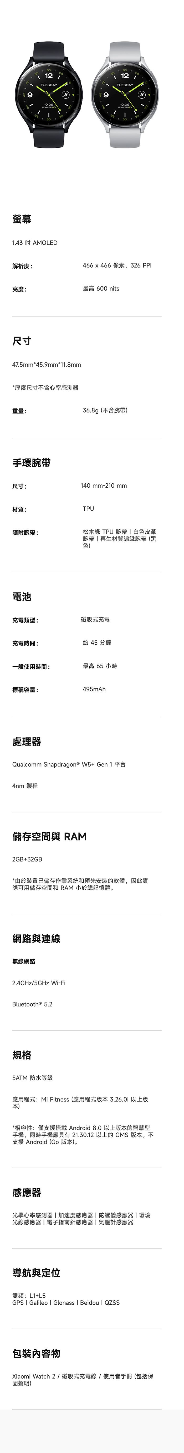 | 內容物 | Xiaomi Watch 2 / 磁吸式充電線 / 使用者手冊 (包括保固聲明) |