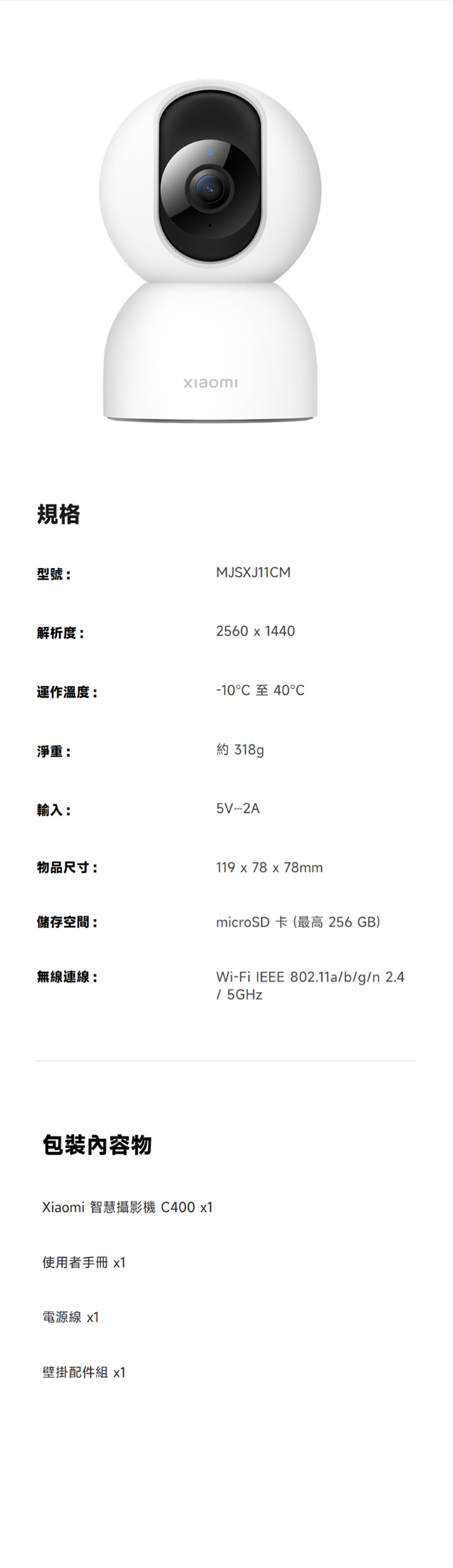 | 【內容物】 | Xiaomi 智慧攝影機 C400 x1 使用者手冊 x1 電源線 x1 壁掛配件組 x1 |