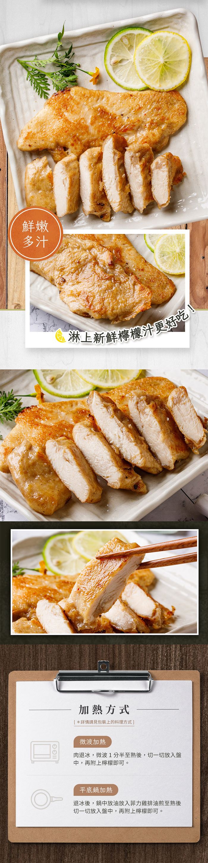 | 注意事項 | *料理方式:退冰後,鍋中放油放入菲力雞排油煎至熟切一切放入盤中附檸檬船即可。 另外也可油煎1分鐘後半熟後微30秒即可出可以加快時間 *美味建議:手工現做料理包,確保新鮮美味,都會建議在3個月內食用完畢唷! *為了保持新鮮度,不可反覆退冰 *非供即食,需充分加熱 |