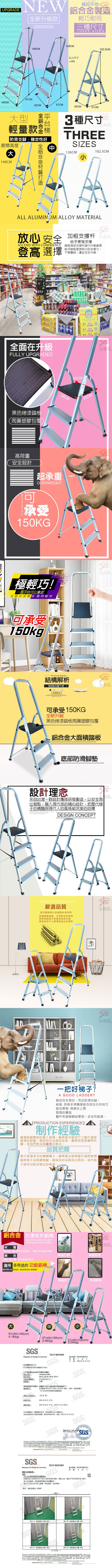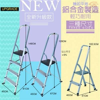 | 包裝內容/商品規格 | 商品規格: (展開尺寸)81x46x149cm(±5%) (收折尺寸)46x12.5x158cm(±5%) (踏板尺寸)25x25cm(±5%) (四階踏板至地面高度)約87cm(±5%) (三階踏板至地面高度)約65cm(±5%) (二階踏板至地面高度)約41cm(±5%) (一階踏板至地面高度)約21cm(±5%) 商品重量:4.18kg 顏色:銀色(最上層:烤漆踏板為黑色) 產地:台灣 |