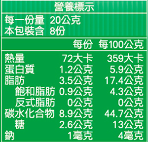 過敏原資訊 本產品含有花生。本產品之製造工廠生產含有麩質的穀類、甲殼類、蛋類、魚類、大豆、奶類、堅果製品、芒果、芹菜、芝麻與軟體動物類的產品於同一工廠生產,食物過敏者請留意。