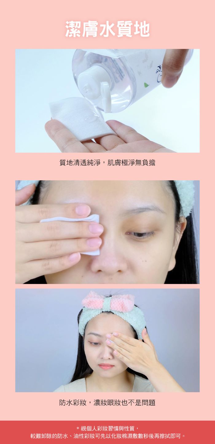 | 使用方法 | 取適量潔膚水於化妝棉上,輕柔擦拭卸除彩妝和髒汙,眼部或唇部較難卸淨的防水彩妝建議以化妝棉濕敷10~15秒後再擦除,最後直接以清水洗淨,可無須再用洗面乳。 |