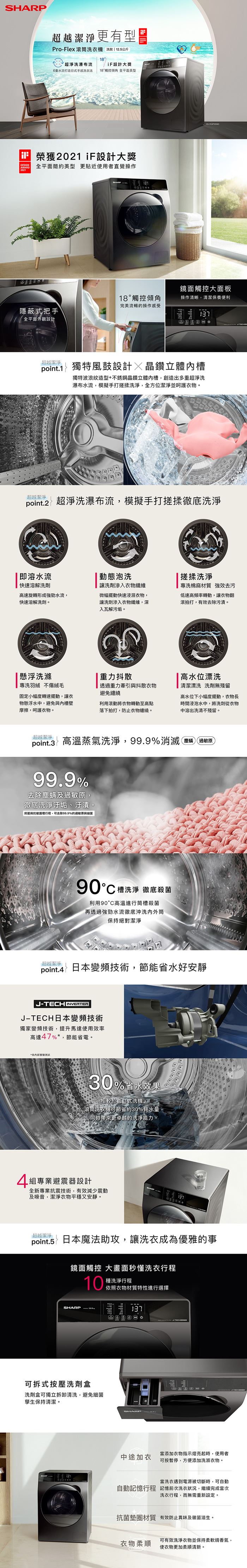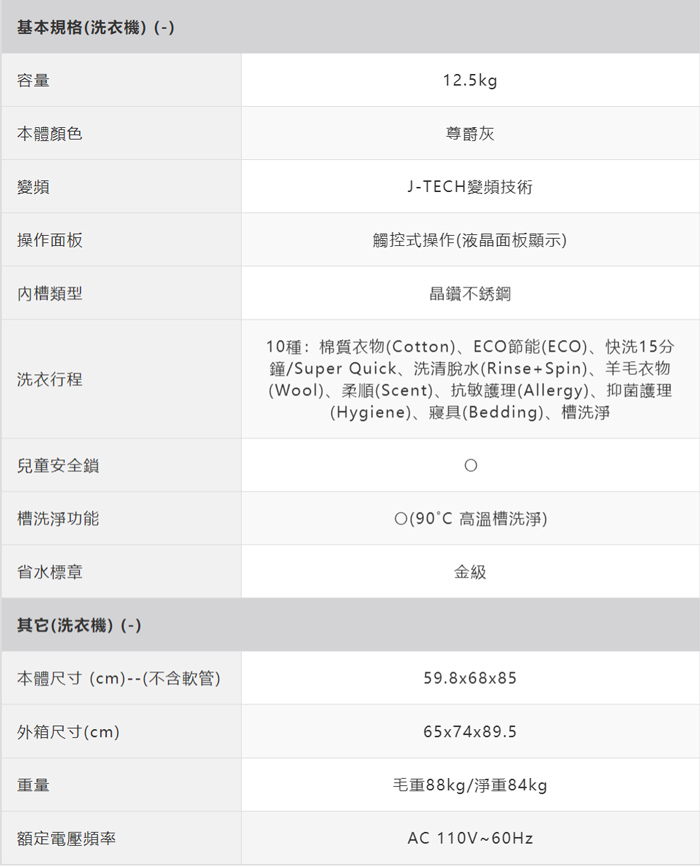 | 商品名稱 | SHARP夏普 12.5公斤變頻溫水洗脫烘滾筒洗衣機 尊爵灰 |