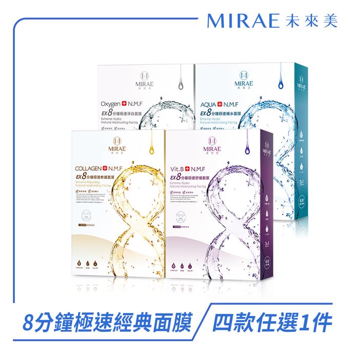 | 商品名稱/包裝內容規格 | MIRAE 未來美 EX8分鐘極速面膜 (5片/盒) x 2盒 (補水/淨白/舒緩/修護,4款擇一出貨) |