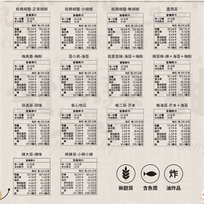 @經典椒鹽-正常胡椒:胡椒、鹽、大简香、小萄香、肉桂、甘草、三奈、丁香、味精。 @苔小弟-海苔:海苔、胡椒照、大萌香、小药香、肉桂、甘草、三秦、丁香、味精。 蒜逃哥-蒜味:蒜頭、品質改良劇(二氧化矽)、姿芽糊精、胡椒、鹽、大茴香、小茴香、肉桂、甘草、三奈、丁香、味精 |