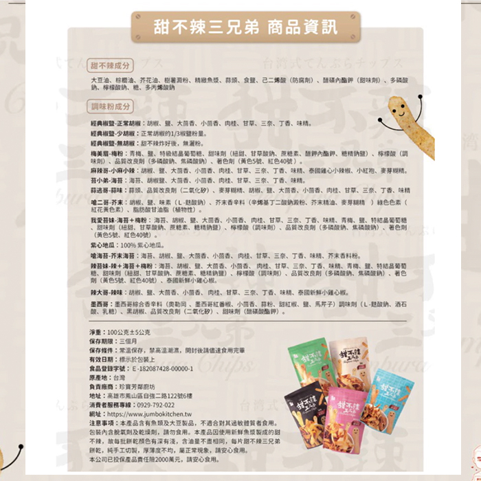 | 注意事項 | 本品含有魚類及大豆製品,不適合對其過敏體質者食用。 包装内含脫氧劑及乾燥劑,請勿食用。本產品因使用新鮮魚漿製成的甜不辣,故每批餅乾颜色有深有淺,含油量不盛相同,每片甜不辣三兄弟餅乾,純手工切製,原薄应不均,屬正第現象,請安心食用。 本公司已投保產品贵任險2000萬元,請安心食用。 |