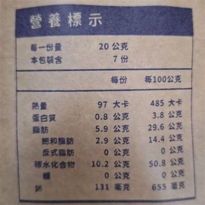 內容物(完整成份/食品添加物) 脫水馬鈴薯.馬鈴薯澱粉.鹽.薑黃粉、棕油、海苔調味粉,甜味劑(蔗糖素).焦糖色素 大豆油