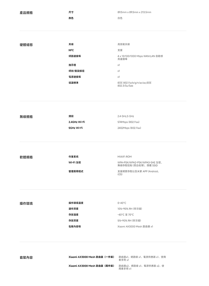 | 【商品名稱/型號】 | 【小米】Xiaomi AX3000 Mesh 路由器 (兩件裝) |