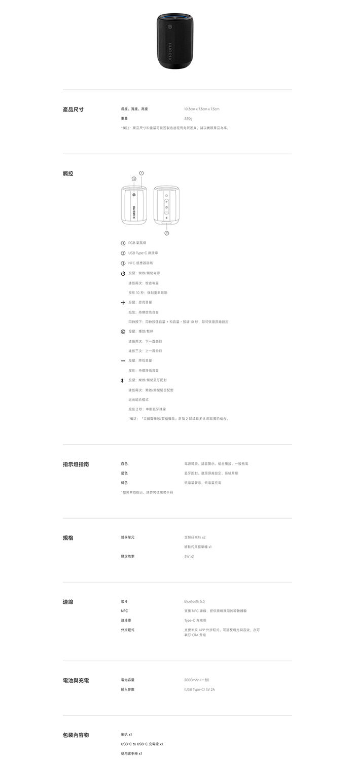 | 內容物 | 喇叭 x1 USB-C to USB-C 充電線 x1 使用者手冊 x1 |