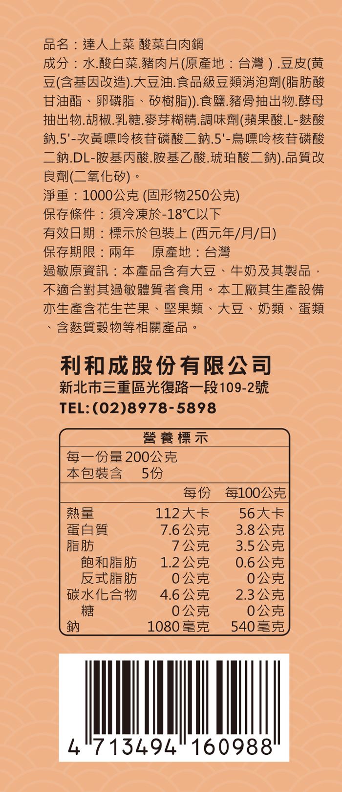 | 商品名稱 | 達人上菜酸菜白肉鍋1000g |