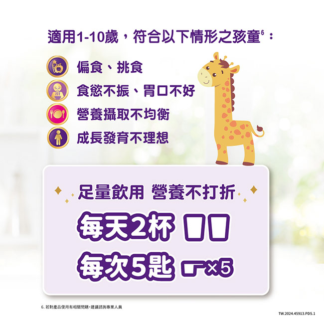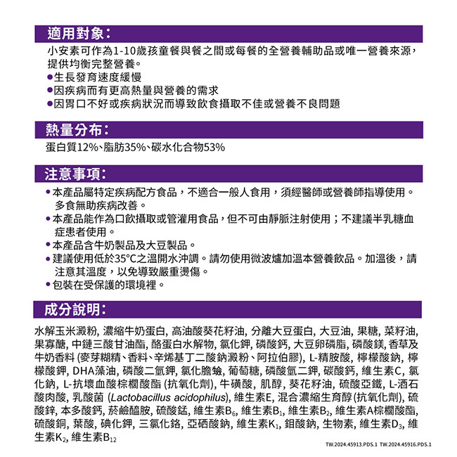 | 注意事項 | •本產品不建議供半乳糖血症患者使用。 •本產品不可由靜脈注射使用。 •本品屬特定疾病配方食品,不適合一般人食用,須經醫師或營養師指導使用。多食無助疾病改善。 •請勿使用微波爐加溫本營養飲品,以免導致嚴重燙傷。 •使用超過35℃之熱水沖調,可能影響益生菌效益。 •本產品含牛奶製品及大豆製品。 •本產品能作為口飲攝取或管灌用食品。 |