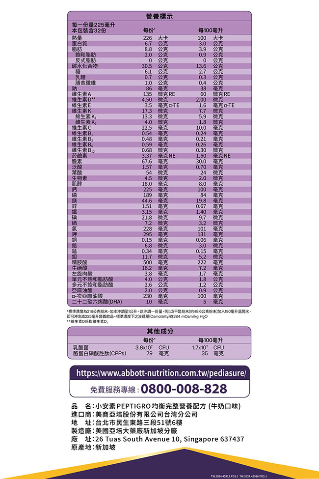 | 內容物(完整成份/食品添加物) | 水解玉米澱粉, 濃縮牛奶蛋白, 高油酸葵花籽油, 分離大豆蛋白, 大豆油, 果糖, 菜籽油, 果寡醣, 中鏈三酸甘油酯, 酪蛋白水解物, 氯化鉀, 磷酸鈣, 大豆卵磷脂, 磷酸鎂, 香草及牛奶香料(麥芽糊精、香料、辛烯基丁二酸鈉澱粉、阿拉伯膠), L-精胺酸, 檸檬酸鈉, 檸檬酸鉀, DHA藻油, 磷酸二氫鉀, 氯化膽(生僉), 葡萄糖, 磷酸氫二鉀, 碳酸鈣, 維生素C, 氯化鈉, L-抗壞血酸棕櫚酸酯(抗氧化劑),牛磺酸, 肌醇, 葵花籽油, 硫酸亞鐵, L-酒石酸肉酸, 乳酸菌 (Lactobacillus acidophilus), 維生素E, 混合濃縮生育醇 (抗氧化劑), 硫酸鋅, 本多酸鈣, 菸鹼醯胺, 硫酸錳, 維生素B6, 維生素B1, 維生素B2, 維生素A棕櫚酸酯, 硫酸銅, 葉酸, 碘化鉀, 三氯化鉻, 亞硒酸鈉, 維生素K1, 鉬酸鈉, 生物素, 維生素D3, 維生素K2, 維生素B12 |