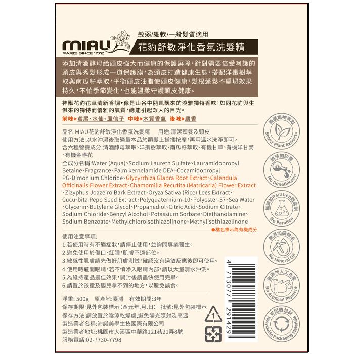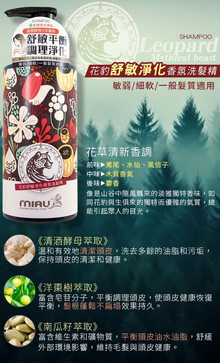 | 商品名稱/包裝內容規格 | 【MIAU】花豹舒敏淨化香氛洗髮精500g x 1瓶 |