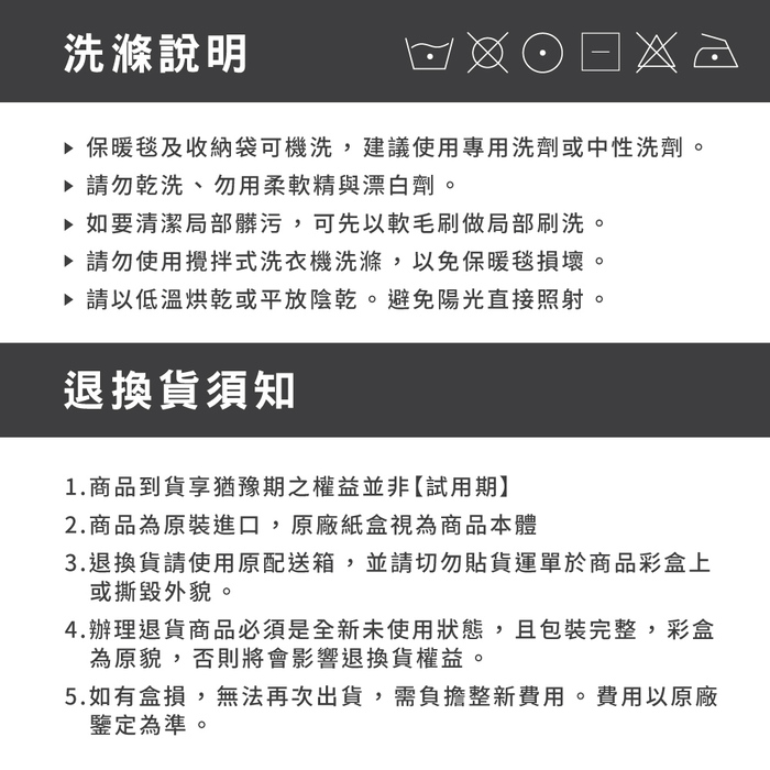 保暖毯及收納袋可機洗,建議使用專用洗劑或中性洗劑。
