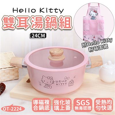 | 包裝內容/商品規格 | 24cm雙耳湯鍋*1個 24cm矽膠玻璃鍋蓋*1個 KITTY 圍裙*1件 重量:約1850g 容量:約4000ml |