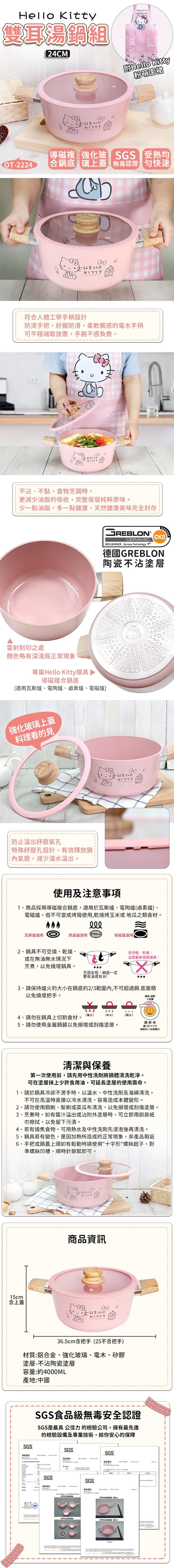 | 內容物 | 24cm雙耳湯鍋*1個 24cm矽膠玻璃鍋蓋*1個 KITTY 圍裙*1件 |