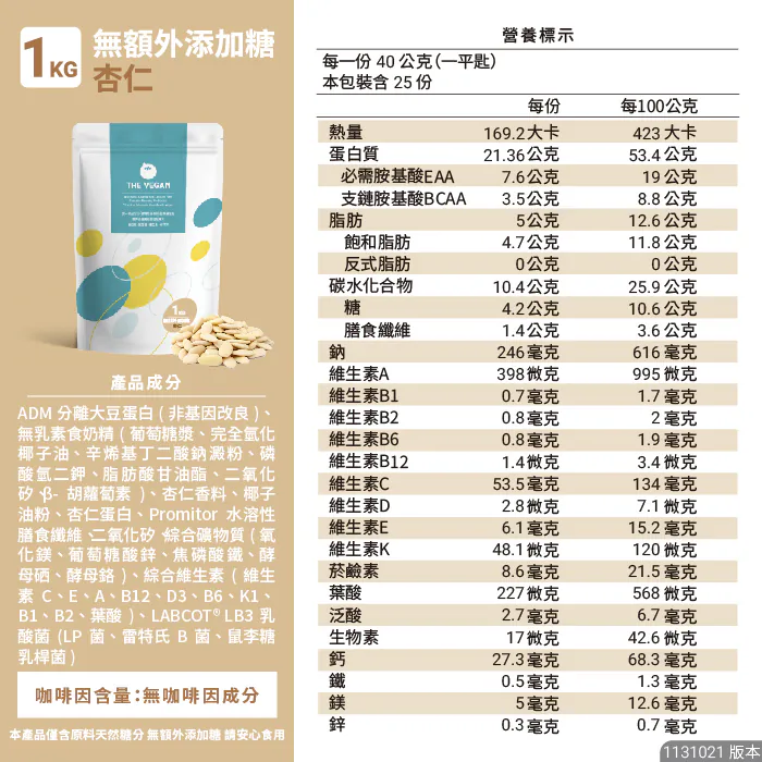 【樂維根】植物性分離大豆蛋白-1kg裝 (無加糖杏仁)+加贈:樂飲杯x1 |