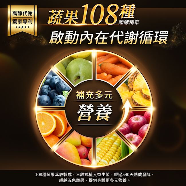 | 內容物 (完整成份/食品添加物) | 玉米來源可溶性纖維、青梅精發酵粉(蔬果醱酵液(青梅)、麥芽糊精、玉米澱粉)、異麥芽寡糖、108綜合蔬果醱酵粉(麥芽糊精、鳳梨、蘿蔔、番薯葉、萵苣、番茄、木瓜、檸檬、菠菜、甘藍、絲瓜、蘋果、葡萄柚、冬瓜、蕪菁、芥菜、番薯、胡蘿蔔、金桔、小白菜、苦瓜、水梨、空心菜、青江菜、甜瓜、瓠瓜、甜椒、梅子、芥藍、山藥、生薑、黃瓜、小松葉、葡萄、南瓜、青花菜、芹菜、隼人瓜、蓮霧、番石榴、西瓜、銀耳、花椰菜、青椒、印度棗、酪梨、哈密瓜、蘆筍、黃豆、楊桃、薏苡仁、黑木耳、紅鳳菜、甜菜根、豆瓣菜、馬鈴薯、釋迦、枇杷、木薯、莧菜、酸橘、百香果、龍鬚菜、白菜、豌豆苗、椰子、諾麗果、昆布、柳橙、茄子、紅甘蔗、桃子、美國芹菜、紅豆、李子、菜豆、綠豆、紫菜、香蕉、金針菇、火龍果、荔枝、蓮藕、柿子、芋頭、香菇、玉米、奇異果、黑豆、豆薯、芒果、桑椹、柑橘、茼蒿、櫻桃、豌豆、龍眼、草莓、菱角、牛蒡、紫蘇、蓮子、藍莓、秋葵、蔓越莓、紅棗、枸杞、銀杏、黑米)、香料、玉米澱粉、百香果果汁粉(砂糖、麥芽糊精、百香果汁、檸檬酸、檸檬酸鈉、香料、β-胡蘿蔔素)、納豆菌(納豆菌發酵物(含納豆菌Bacillus subtilis)、濃縮乳清蛋白(乳清蛋白、葵花卵磷脂) 、菊苣纖維、鳳梨酵素(麥芽糊精、鳳梨酵素)、決明子萃取物(決明子萃取物、麥芽糊精)、DL-蘋果酸、藤黃果萃取、植物複合酵素(麥芽糊精、酵素製劑(澱粉分解酵素、蛋白分解酵素、脂肪分解酵素、乳糖分解酵素、纖維分解酵素))、二氧化矽、複方木瓜酵素(葡萄糖、木瓜酵素)、綜合醣化粉(麥芽糊精、乳糖、澱粉水解酵素、小麥萃取物)、磷酸鎂、葡萄糖酸鋅、磷酸鈣、植物乳桿菌(Lactobacillus plantarum)、蔗糖素(甜味劑)、吡啶甲酸鉻。 | |