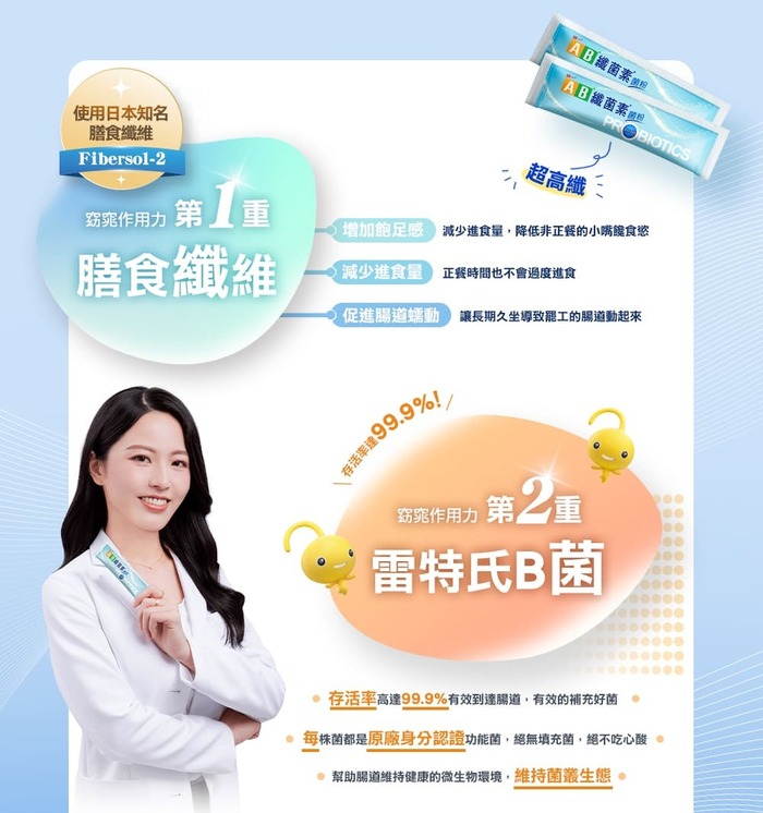 | 內容物 (完整成份/食品添加物) | 難消化性麥芽糊精(Fibersol®-2)、香料 (蔗糖、優格發酵液、麥芽糊精、香料、柑橘果膠(含蔗糖)、濃縮柳橙汁)、葡萄糖、活性乳酸菌粉(亞斯菲德菌Lactobacillus acidophilus、葡萄糖、雷特氏B菌Bifidobacterium lactis Bb-12)、酵素(麥芽糊精、澱粉分解酵素、蛋白酵素、植酸酵素、糖化酵素、脂肪分解酵素、鳳梨酵素、轉化酵素、半纖維素分解酵素、果膠酵素、半乳糖苷酵素、胜肽分解酵素、乳糖酵素、澱粉糖化分解酵素、纖維素分解酵素)、木寡醣、硬脂酸鎂 |