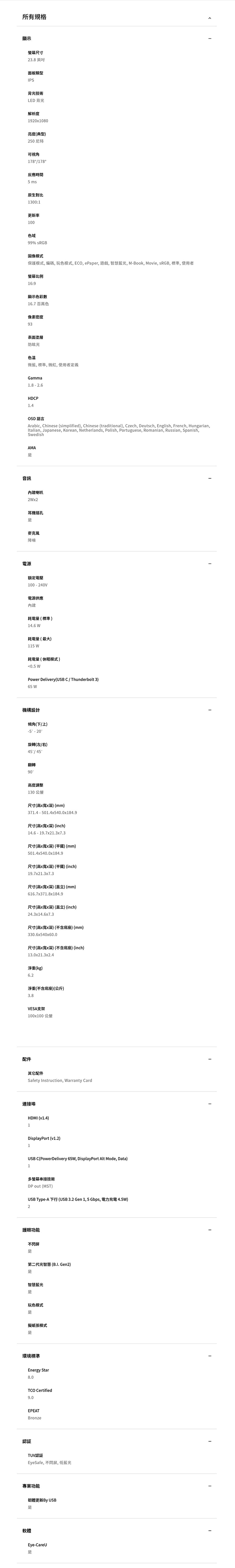 | 【規格或顏色】 | 23.8吋/IPS/1920x1080/2Wx2 |