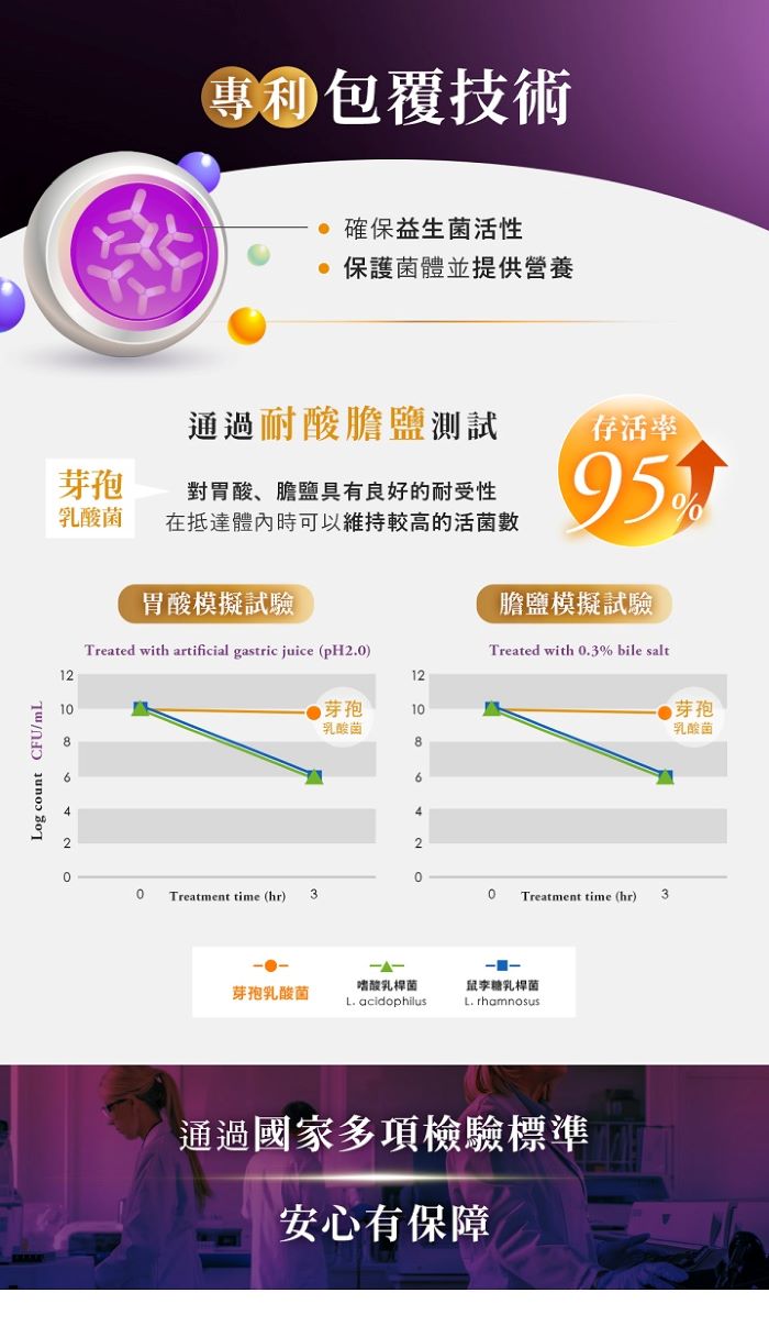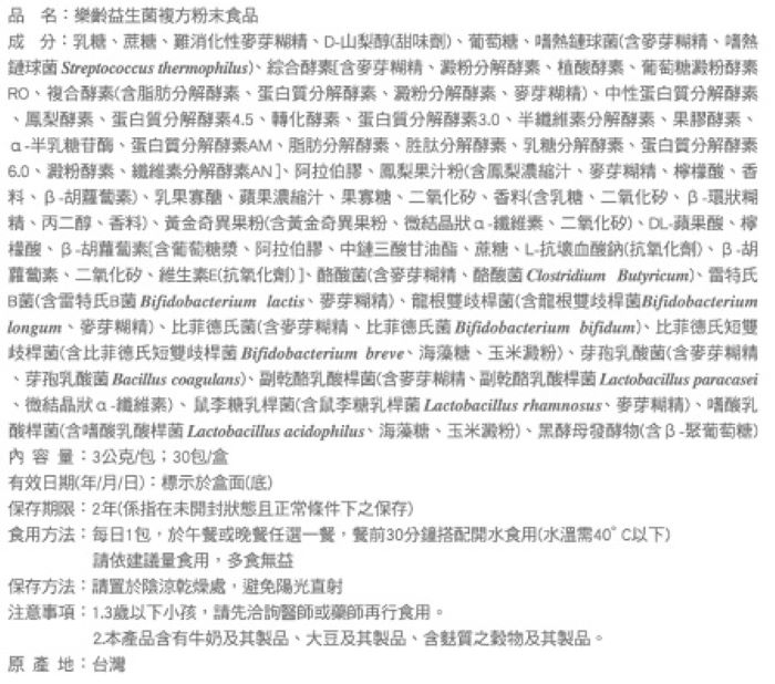 | 內容物 (完整成份/食品添加物) | 乳糖、蔗糖、難消化性麥芽糊精、D-山梨醇(甜味劑)、葡萄糖、嗜熱鏈球菌(含麥芽糊精、嗜熱鏈球菌Streptococcus thermophilus)、綜合酵素[含麥芽糊精、澱粉分解酵素、植酸酵素、葡萄糖澱粉酵素RO、複合酵素(含脂肪分解酵素、蛋白質分解酵素、澱粉分解酵素、麥芽糊精)、中性蛋白質分解酵素、鳳梨酵素、蛋白質分解酵素4.5、轉化酵素、蛋白質分解酵素3.0、半纖維素分解酵素、果膠酵素、α-半乳糖苷酶、蛋白質分解酵素AM、脂肪分解酵素、胜肽分解酵素、乳糖分解酵素、蛋白質分解酵素6.0、澱粉酵素、纖維素分解酵素AN]、阿拉伯膠、鳳梨果汁粉(含鳳梨濃縮汁、麥芽糊精、檸檬酸、香料、β-胡蘿蔔素)、乳果寡醣、蘋果濃縮汁、果寡糖、二氧化矽、香料(含乳糖、二氧化矽、β-環狀糊精、丙二醇、香料)、黃金奇異果粉(含黃金奇異果粉、微結晶狀α-纖維素、二氧化矽)、DL-蘋果酸、檸檬酸、β-胡蘿蔔素[含葡萄糖漿、阿拉伯膠、中鏈三酸甘油酯、蔗糖、L-抗壞血酸鈉(抗氧化劑)、β-胡蘿蔔素、二氧化矽、維生素E(抗氧化劑)]、酪酸菌(含麥芽糊精、酪酸菌Clostridium Butyricum)、雷特氏B菌(含雷特氏B菌Bifidobacterium lactis、麥芽糊精)、龍根雙歧桿菌(含龍根雙歧桿菌Bifidobacterium longum、麥芽糊精)、比菲德氏菌(含麥芽糊精、比菲德氏菌Bifidobacterium bifidum)、比菲德氏短雙歧桿菌(含比菲德氏短雙歧桿菌Bifidobacterium breve、海藻糖、玉米澱粉)、芽孢乳酸菌(含麥芽糊精、芽孢乳酸菌Bacillus coagulans)、副乾酪乳酸桿菌(含麥芽糊精、副乾酪乳酸桿菌Lactobacillus paracasei、微結晶狀α-纖維素)、鼠李糖乳桿菌(含鼠李糖乳桿菌Lactobacillus rhamnosus、麥芽糊精)、嗜酸乳酸桿菌(含嗜酸乳酸桿菌Lactobacillus acidophilus、海藻糖、玉米澱粉)、黑酵母發酵物(含β-聚葡萄糖) |