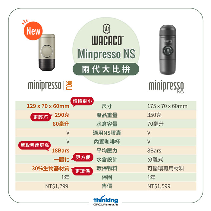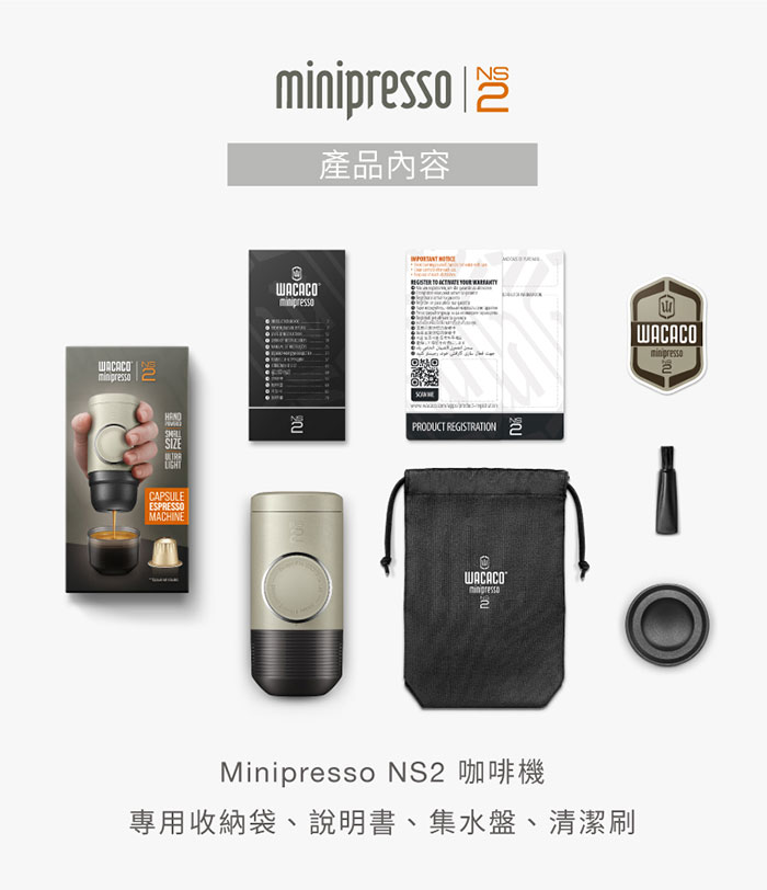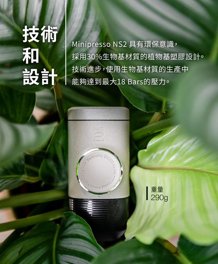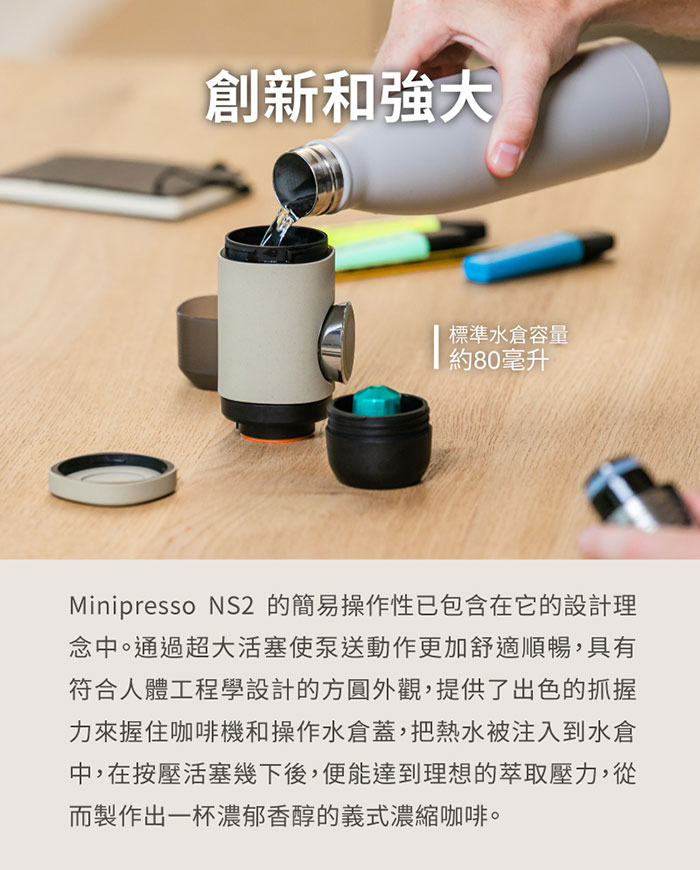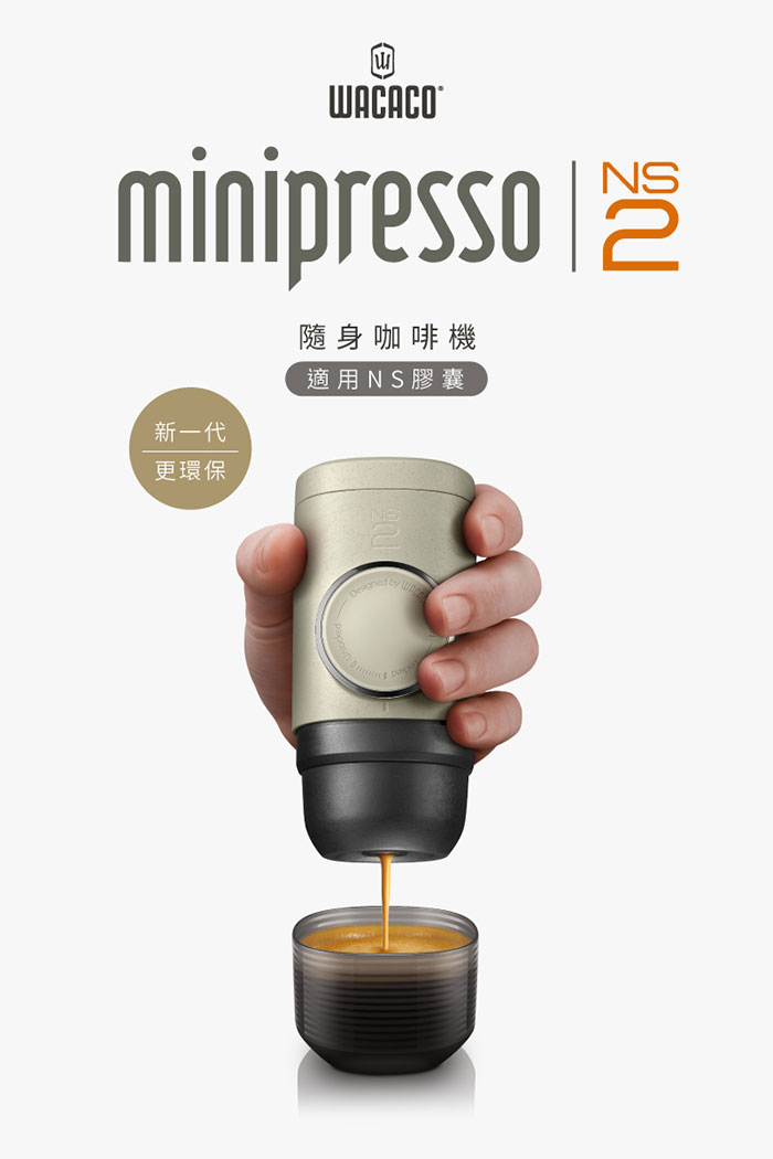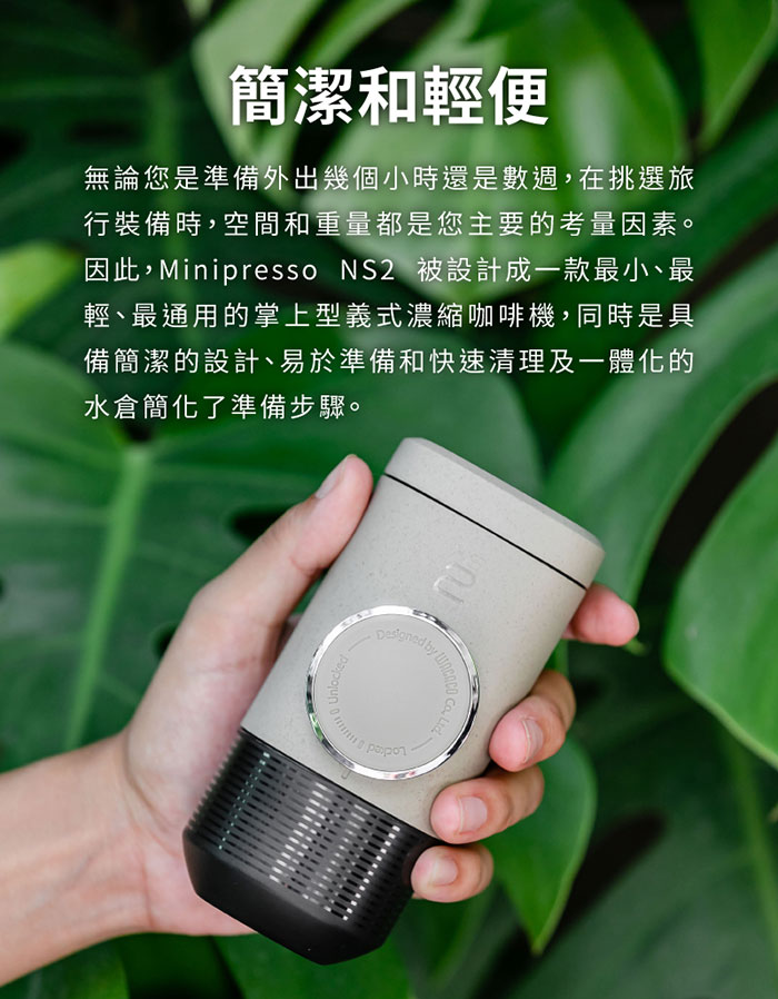 Minipresso NS2被設計成一款最小、最輕、最通用的掌上型義式濃縮咖啡機,同時是具備簡潔的設計、易於準備和快速清理及一體化的水倉簡化了準備步驟。