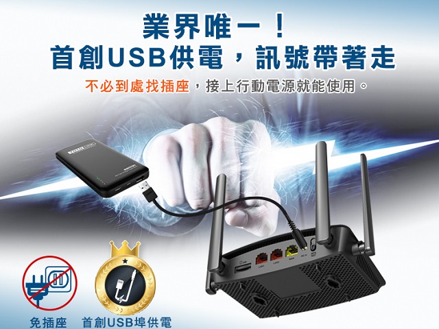 ✅首創 USB 供電,只要有行動電源就能把訊號帶著走。