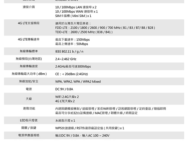 | 【內容物】 | LR350產品本體 x 1 電源供應器 x 1 SIM轉接卡 x 1 USB轉DC電源線(0.8m) x 1 快速安裝手冊 x 1 |