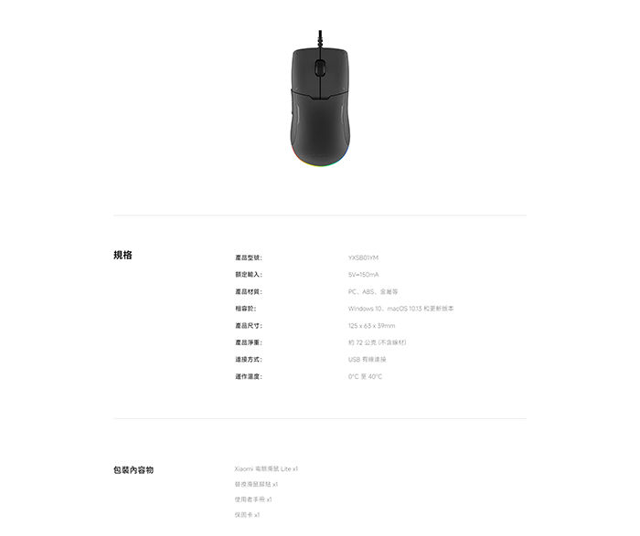 | 【內容物】 | Xiaomi 電競滑鼠 Lite x1 替換滑鼠腳貼 x1 使用者手冊 x1 保固卡 x1 |