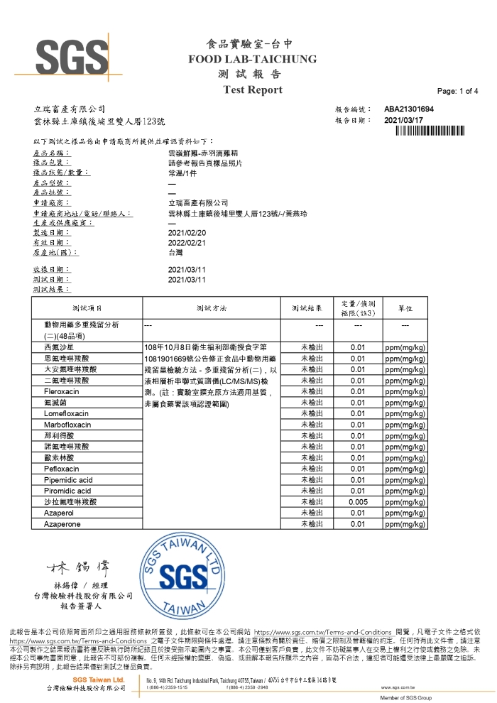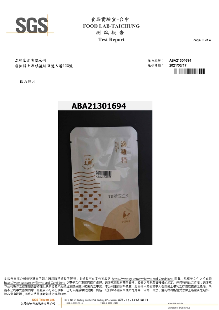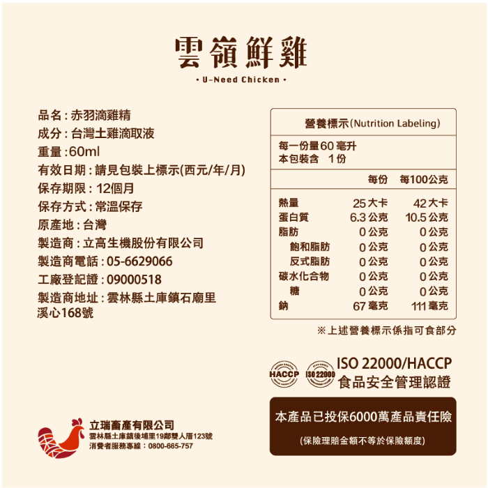 | 內容物(完整成份/食品添加物) | 100%台灣土雞滴取液 |