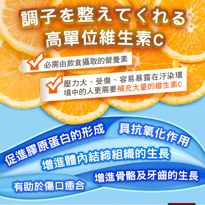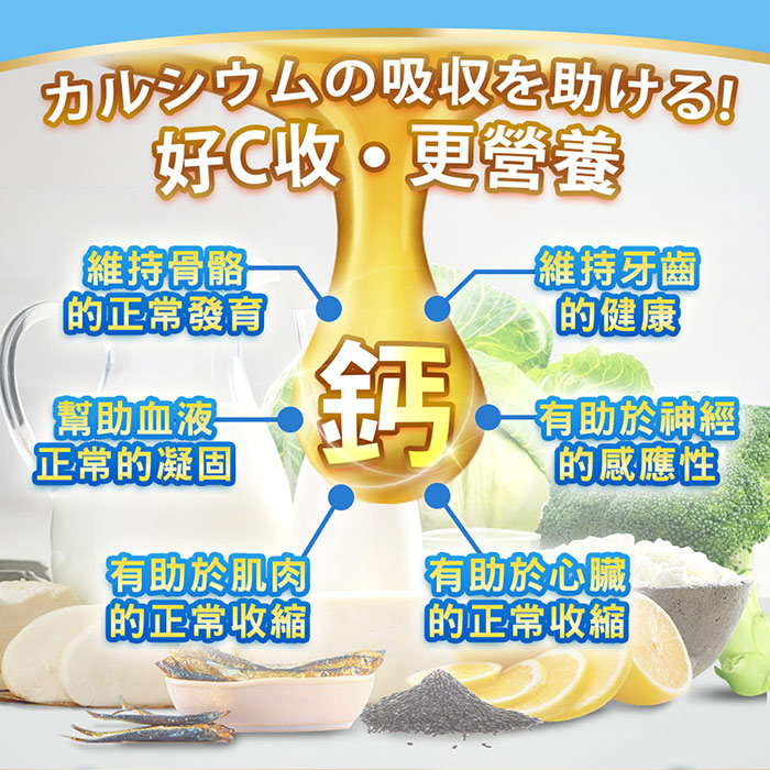 | 內容物 (完整成份/食品添加物) | 檸檬酸鈣、砂糖(砂糖、麥芽糊精)、D-山梨醇(甜味劑)、L-抗壞血酸、L-抗壞血酸鈉、乳糖、脂肪酸蔗糖酯、阿拉伯膠、硬脂酸鎂、阿斯巴甜(甜味劑)、二氧化矽、柳橙香料粉{辛烯基丁二酸鈉澱粉、麥芽糊精、柳橙香料【香料、混合濃縮生育醇(抗氧化劑)】、脂肪酸甘油酯、混合濃縮生育醇(抗氧化劑)}、食用黃色四號鋁麗基 |