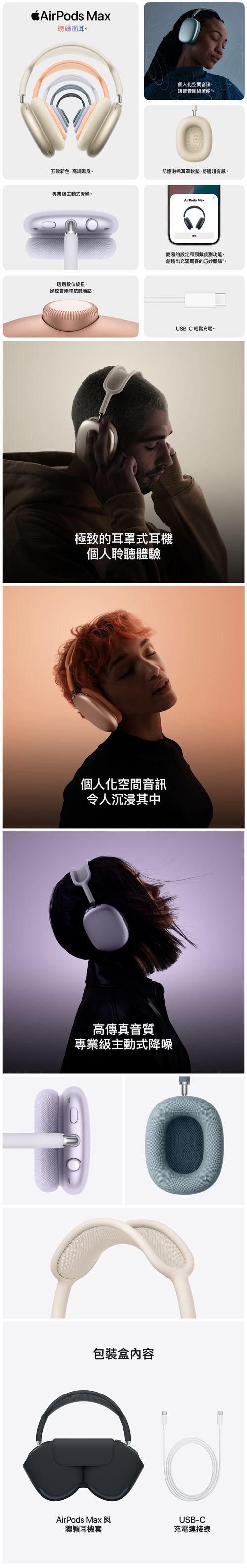 | 產品文案介紹 | 極致的耳罩式耳機個人聆聽體驗,現推出全新色系。AirPods Max 提供細節令人驚豔的高傳真音質。 「個人化空間音訊」搭配動態頭部追蹤功能,讓聲音圍繞著你 註腳 ⁴。專業級「主動式降噪」可降低擾人聲響 註腳 ³。 「通透模式」則讓你舒適地聽見周遭的聲音。充電一次的電池續航力最長可達 20 小時 註腳 ¹³。 簡易的設定和頭戴偵測功能,創造出充滿驚喜的巧妙聆聽體驗。現可透過 USB-C 輕鬆充電。 |