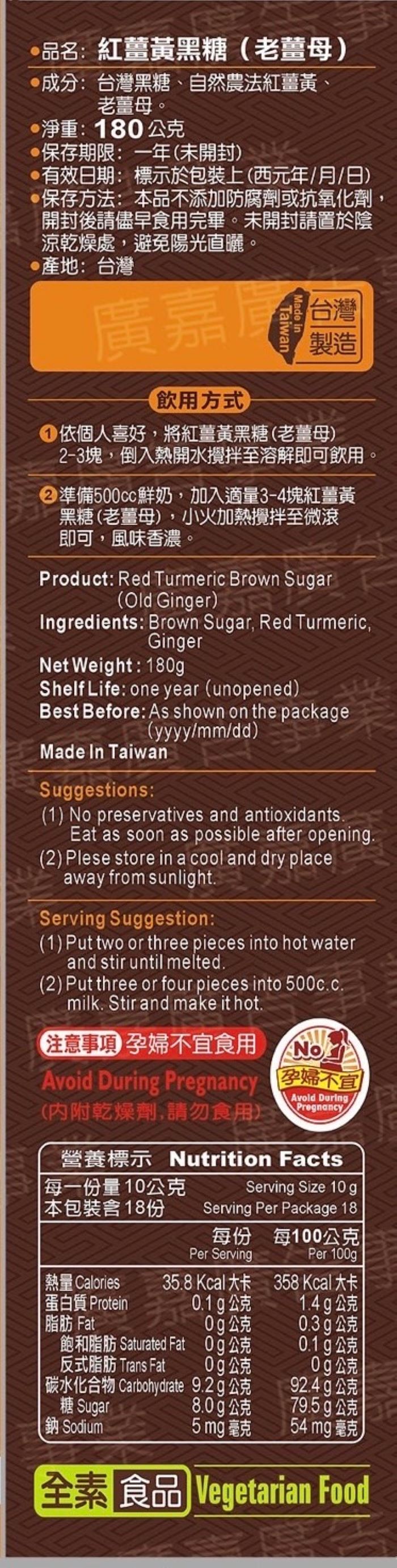 | 內容物(完整成份/食品添加物) | 台灣黑糖、自然農法紅薑黃、老薑母 |