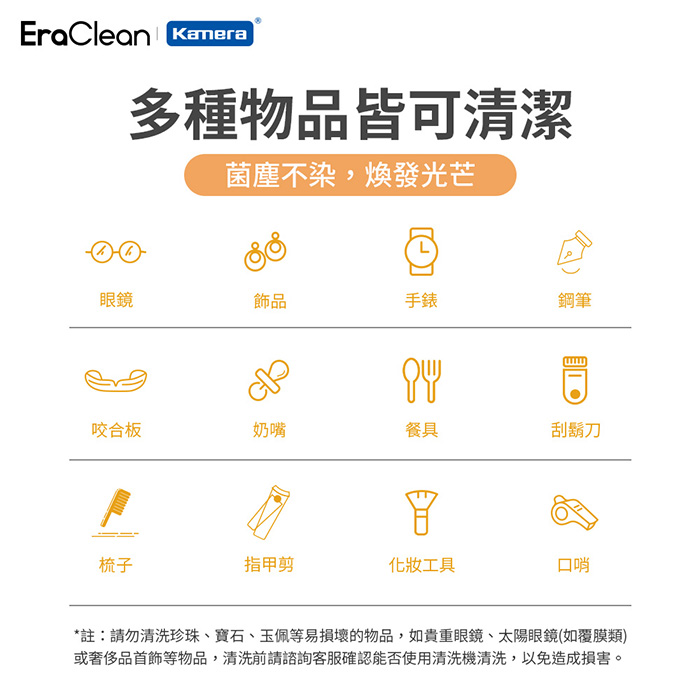 - 多種物品皆可清潔,像是眼鏡、飾品、手錶、鋼筆、咬合板、奶嘴……等等,滿足您日常清潔所需。