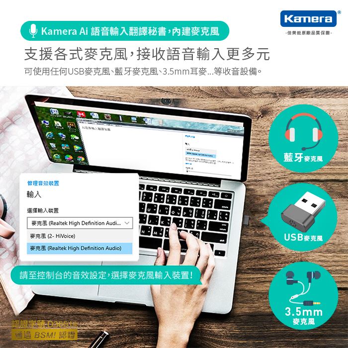 - 可使用任何USB麥克風、藍牙麥克風、3.5mm耳麥…等收音設備。