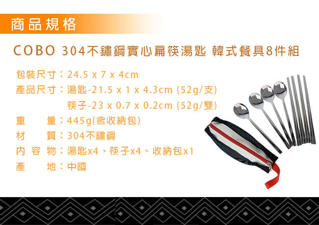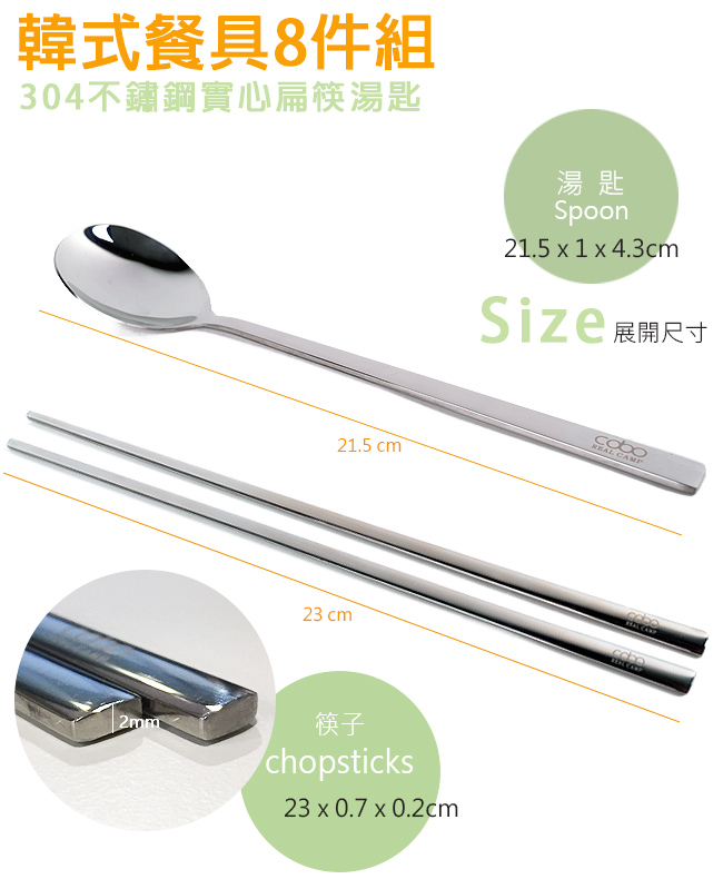 | 【商品名稱或型號】 | 【cobo】304不鏽鋼實心扁筷湯匙 韓式餐具8件組 |