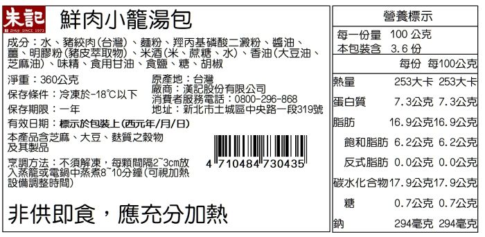 | 內容物(完整成份/食品添加物) | 水、豬絞肉(台灣)、麵粉、羥丙基磷酸二澱粉、醬油、薑、明膠 粉(豬皮萃取物)、米酒(米、蔗糖、水)、大利香油(大豆油、芝麻油)、 味精、食用甘油、食鹽、糖、特級胡椒粉[麩皮粉、麥芽糊精、綠辣椒、 胡椒(11%)、雞心椒、茶枝、八角、當歸(調味用)]、鮮雞晶化-麩酸納、 鹽、馬鈴薯澱粉、糖、香料、羥丙基磷酸二澱粉、調味劑(5”-次黃嘌 呤核苷磷酸二鈉、5, ,-鳥瞟吟核苔磷酸二鈉)、雞油、葡萄糖、B-胡 蘿蔔素[麥芽糊精、辛烯基丁二酸鈉澱粉、葵花籽油、抗氧化劑(L-抗壞 血酸鈉、維生素C、維生素E)、B-胡蘿蔔素]) |