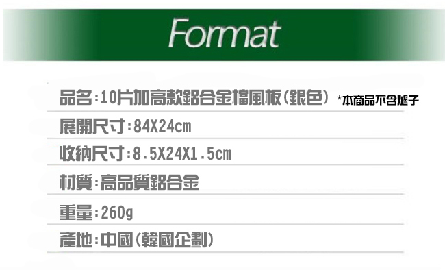 | 【商品名稱或型號】 | 【韓國SELPA】十片加高款鋁合金擋風板(銀色) |