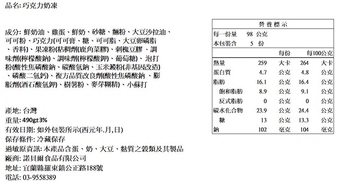 | 過敏原資訊 | 本產品含蛋、奶、麩質之穀類及其製品 |