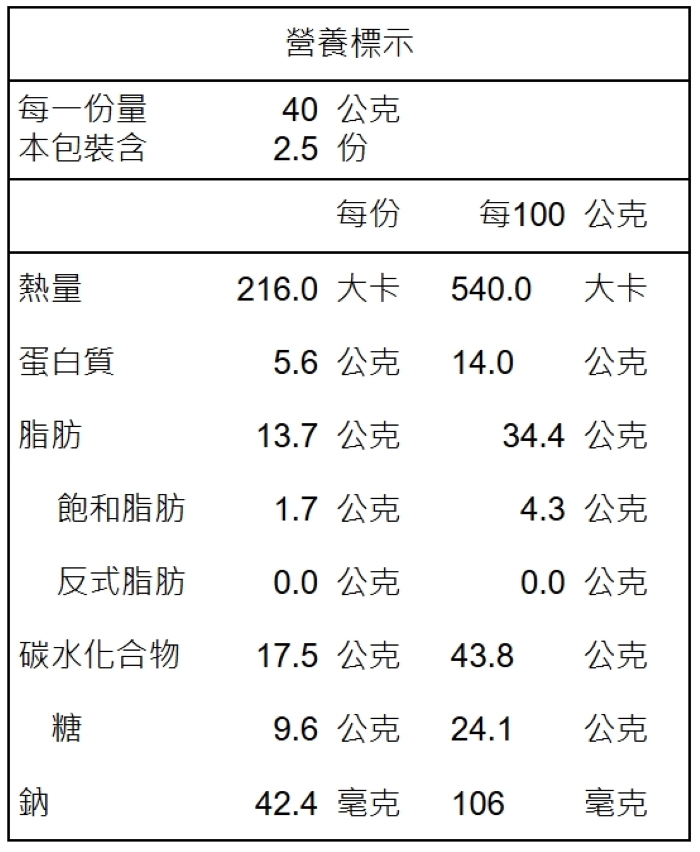 | 過敏原資訊 | 本產品生產製程之廠房,其設備或生產管線,有處理堅果種子類,含有麩質的穀物、豆類及其製品。 |