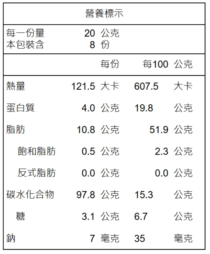 | 保存方法 | 常溫存放,請放置於陰涼處,避免高溫潮濕、陽光照射,拆封後請密封保存並儘速食用完畢。 |