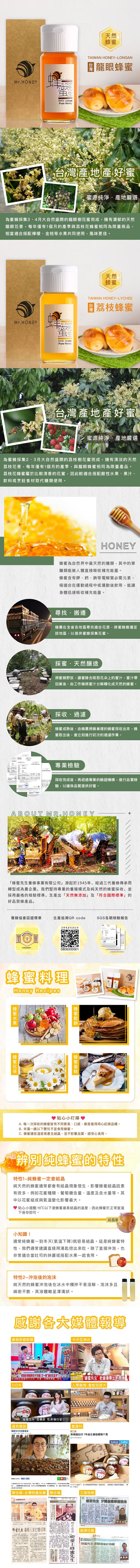 | 商品名稱 | 【蜂蜜先生】台灣經典蜂蜜組(龍眼蜂蜜700g+荔枝蜂蜜700g) |