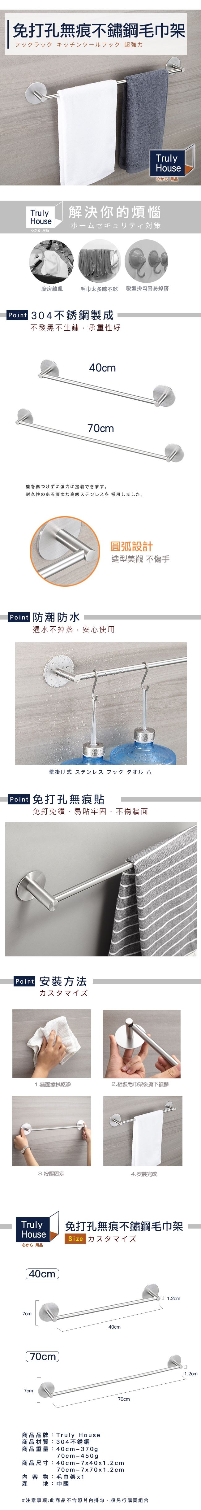 | 商品名稱 | 【Truly House】免打孔304不鏽鋼圓頭單桿毛巾架(40cm)(兩入) |
