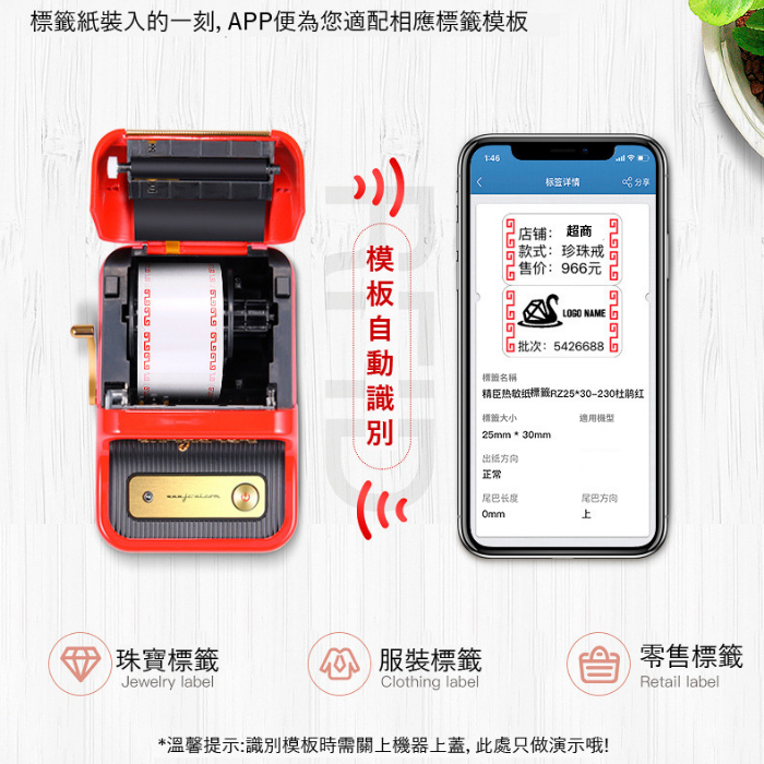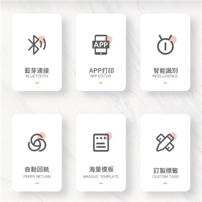 | 注意事項 | 1.請遠離火源及高揮發物環境 2.本商品不適合6歲以下兒童使用,請於成人陪同下使用。 3.標籤機如進水,請立即關閉電源。 4.長時間連續大量使用標籤機結束後,打印頭有可能處於高溫,請勿觸摸,以免燙傷。 5.請勿自行拆解標籤機,以免造成危險。 6.請勿使用帶有腐蝕性之化學物質或清潔劑擦拭本商品。 7.當電池無法滿足列印性能要求時,請立即停止使用,並連絡售後服務中心。 |