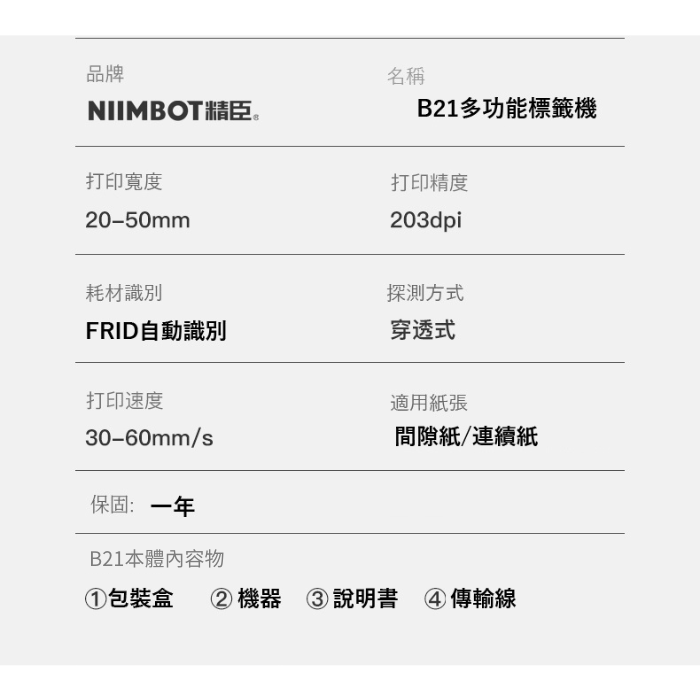 | 內容物 | 精臣B21S標籤機一台、充電線一條、說明書一張、50*30mm白色標籤貼紙一捲 |
