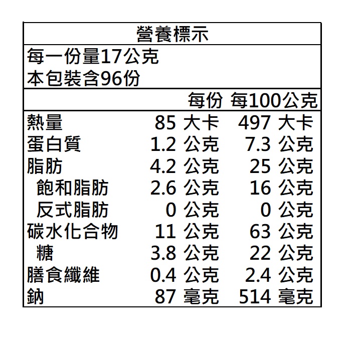 | 包裝內容/商品規格 | 17gX8入(136g)*12入 |