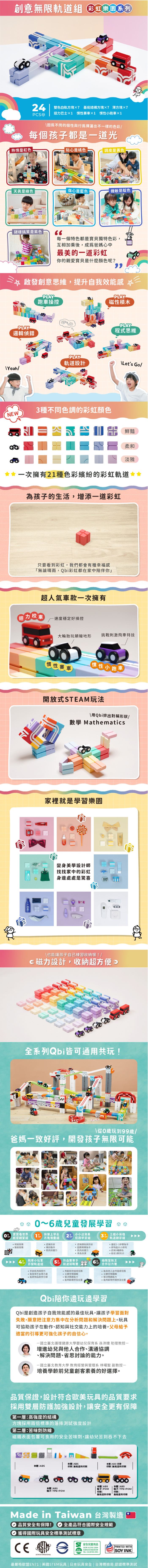 | 用途 | Qbi是結合磁性建構、方塊積木、軌道車組、益智桌遊的玩具,讓孩子發揮想像力與創造力,自由的組建各種形狀,開發無限可能! |