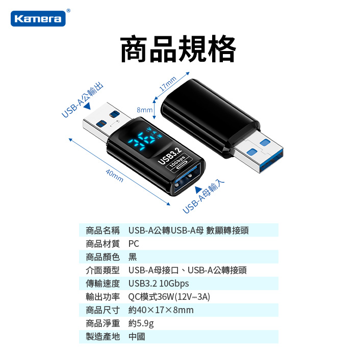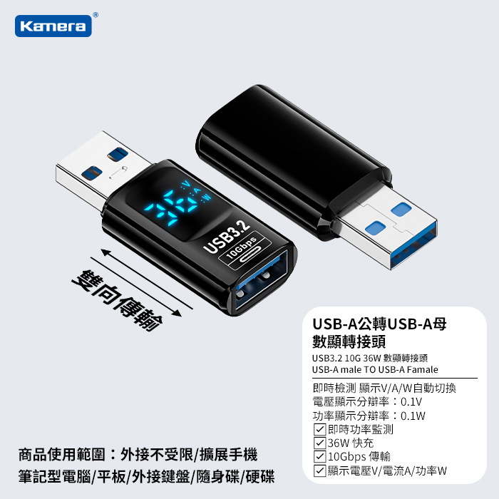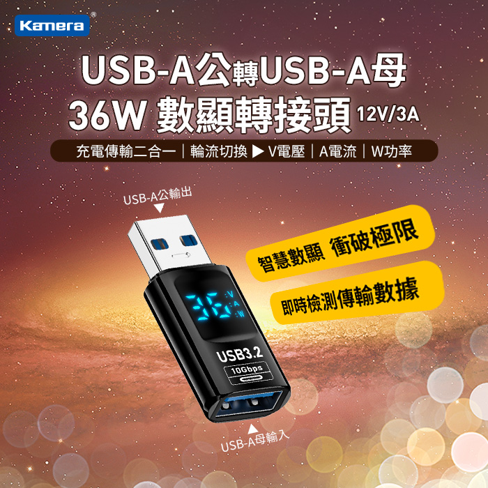 | 商品名稱 | USB-A公轉USB-A母 數顯轉接頭-36W/12V/3A |