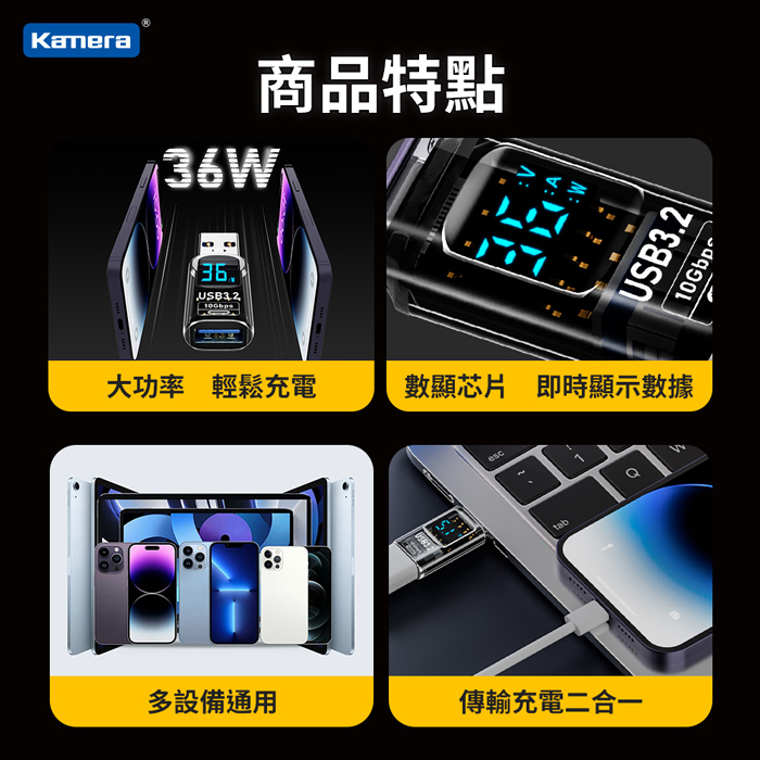 - 支援36W快充,傳輸速率10Gbps,充電傳輸二合一。